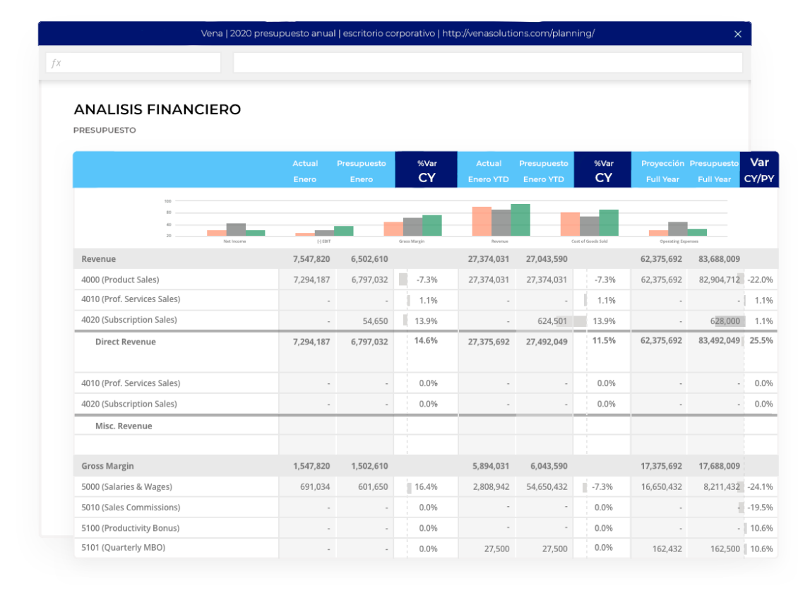 Vena facilita la identificación de las diferencias entre los resultados previstos y los reales para que pueda ajustar sus planes de ingresos. Nuestro software de gestión del desempeño corporativo lo ayuda a analizar la variación y la rentabilidad para que pueda planificar su viaje de crecimiento en función de datos en tiempo real. Incluso puede aprovechar la planificación de escenarios avanzada y los modelos hipotéticos para poder cambiar de rumbo en un abrir y cerrar de ojos.